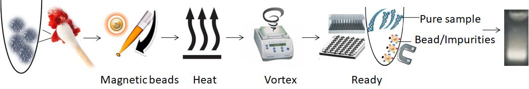 BcMag? One step Touch DNA Direct Kit使用新型負相色譜磁珠,可以從大多數(shù)微量脫落細胞樣本中快速提純出更高質(zhì)量和更高回收率的DNA。這些樣本包括體液、污漬、體液拭子、脫落細胞、煙頭、毛囊、指甲刮屑、上皮細胞、咬痕、精液等掉落的生物體細胞DNA樣本等。經(jīng)過特殊設計的磁珠表面具有我們專有的表面化學功能基團,一旦與樣品混合,可同時裂解細胞并捕獲PCR抑制劑(圖1)。