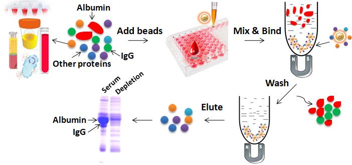 目前常用的白蛋白去除方式為,親和染料配體Cibacron Blue F3GA共價鍵合到市售載體上,用于從水溶液和人血漿中吸附HSA,但這種清除方式缺乏選擇性。在免疫親和系統(tǒng)中,還會使用抗白蛋白抗體進行白蛋白清除。使用蛋白A用于去除IgG蛋白。這些技術(shù)通常具有合理的特異性,但使用成本較高。此外,由于這些清除方式中許多都是基于瓊脂糖樹脂或其衍生柱進行的,因此它們在對濃度較低蛋白進行富集時過程非常耗時,而且無法在短時間內(nèi)處理大量樣品,并且難以適應(yīng)自動化系統(tǒng)。同時,使用這些方法去除蛋白質(zhì)通常需要增加樣品體積來進行實驗,因此需要額外的蛋白質(zhì)濃縮步驟。為解決上述問題,急需具有極高的效率,均勻性和吞吐量的新白蛋白和IG去除方法。