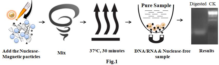 BcMag ? 一步法DNA和RNA清除試劑盒使用核酸內(nèi)切酶固定的磁珠,僅需一步操作就可從樣品中去除DNA和RNA。重組核酸內(nèi)切酶是在大腸桿菌中合成的馬其頓沙雷氏菌的超純重組核酸內(nèi)切酶(由與默克苯甲酸酶核酸酶或渦輪核酸酶同一基因編碼)。這種核酸酶可以非特異性地將各種DNA和RNA變體(包括單鏈和雙鏈DNA和RNA)消化為長(zhǎng)度為2-8個(gè)堿基的5"-磷酸化寡核苷酸,并且不具有蛋白酶活性。含有核酸酶的核酸酶磁性顆粒能有效去除蛋白質(zhì)溶液中的所有核酸(DNA和RNA),且由于核酸酶與磁性顆粒以共價(jià)鍵穩(wěn)定結(jié)合,溶液中不會(huì)殘留核酸內(nèi)切酶。