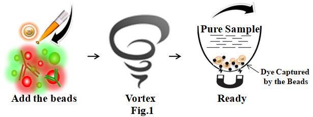 使用程序非常簡(jiǎn)單(圖1)。1.直接將磁珠添加到樣品中。2.用移液器吹吸或渦旋方式捕捉游離染料。3.磁珠從蛋白質(zhì)或DNA/RNA溶液中分離出來(lái),而上清液中含有純化后的生物樣品。
