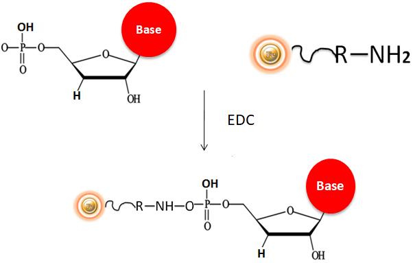 BcMag公司? Quick DNA-RNA共軛試劑盒旨在快速有效地將DNA,RNA或磷酸鹽修飾的RNA/DNA寡核苷酸固定到我們專有的磁珠上。為了更安全的連接,該試劑盒設(shè)計用于使用交聯(lián)劑1-乙基-3-(3-二甲基氨基丙基)碳二亞胺(EDC)將DNA/RNA的5'磷酸基團(tuán)共價固定在胺封端的磁珠上(圖1)。我們專有的中性偶聯(lián)緩沖液使綴合非常有效(>85%)。綴合的DNA非常穩(wěn)定,可用于許多下游應(yīng)用。