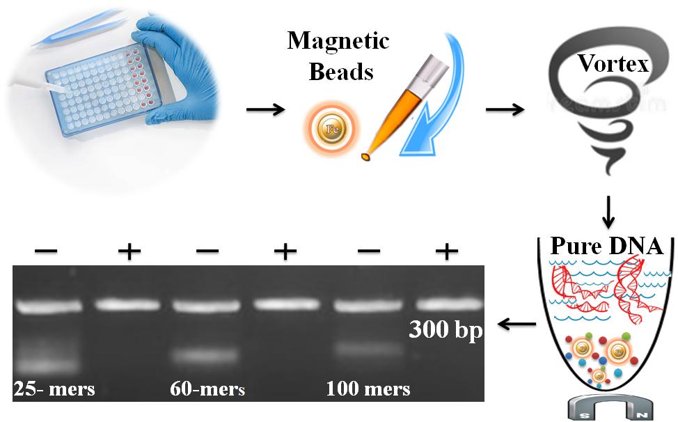 BcMag ? 一步法PCR純化試劑盒是獨(dú)特設(shè)計(jì)的,用于快速,高效純化PCR反應(yīng)體系或者其他DNA反應(yīng)的磁珠類產(chǎn)品。純化過程不僅簡(jiǎn)單(如圖一所示僅需一管,一步),而且可非常靈活的清除不同大小的DNA片段通過調(diào)整樣品的處理時(shí)間,緩沖液的pH和去垢劑的濃度。將磁珠直接添加到反應(yīng)完成的PCR體系或者其他DNA反應(yīng)體系中,通過渦旋將雜質(zhì)和磁珠結(jié)合并清除(例如:多余的引物,二聚體,接頭分子,鹽,去垢劑,dNTPs,以及酶類)。渦旋過后,磁珠被磁座吸附,同時(shí)上清液中包含已純化的核酸樣品。僅需1分鐘,被純化的DNA可用于下游應(yīng)用,例如桑格測(cè)序,限制酶切,克隆,SNP檢測(cè),或者NGS文庫(kù)準(zhǔn)備。該磁珠可以在不到10分鐘的時(shí)間內(nèi)同時(shí)處理96個(gè)樣品。
