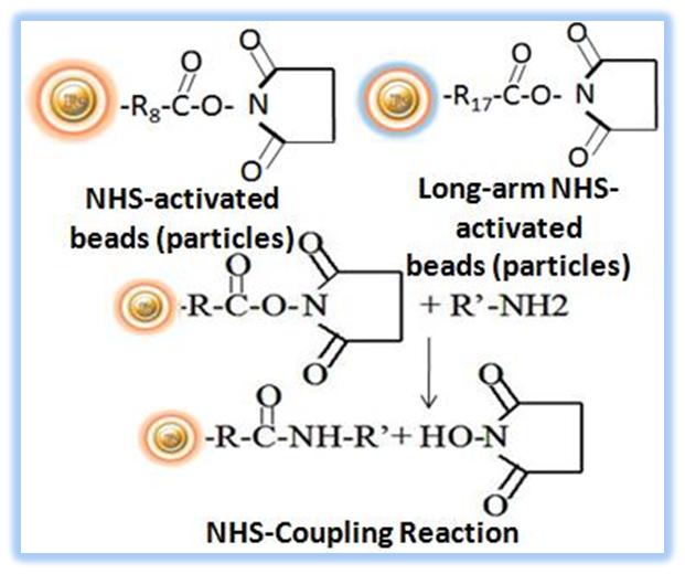 BcMag ? NHS活化磁珠是均勻的,表面涂有高密度NHS(N-羥基琥珀酰亞胺)官能團(tuán)的磁珠。磁珠利用可靠的NHS酯進(jìn)行化學(xué)固定,不需要使用危險(xiǎn)化學(xué)品。而且本磁珠具有較低的非特異性結(jié)合率,并且不會造成偶聯(lián)配體的泄漏。通過形成穩(wěn)定的酰胺鍵(圖1),偶聯(lián)效率超過85%,該磁珠可以快速,有效地共價結(jié)合任何含伯胺的配體。Bioclone NHS活化磁珠反應(yīng)僅需不到一個小時(在室溫pH 7-9下為15-30分鐘,在4°C下為4小時),就可以產(chǎn)生非常穩(wěn)定的連接。建議使用BcMag ?長臂NHS活化磁珠固定小分子多肽,因?yàn)殚L臂親水接頭可以減少空間位阻。磁性樹脂可用于各種親和純化方法。
