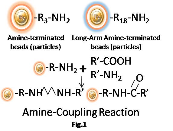 BcMag ? 氨基磁珠是在表面上連接有高密度伯胺官能團(tuán)的磁珠。磁珠可以共價結(jié)合伯胺或含羧基的配體,例如蛋白質(zhì)和肽,用于親和純化反應(yīng)(圖1)。它的親水表面確保磁珠優(yōu)異的分散性,并且易于在各種緩沖液中處理。BcMag ? 氨基磁珠最適合結(jié)合較大的蛋白質(zhì)。BcMagTM長臂氨基磁珠適用于結(jié)合小分子多肽,因?yàn)殚L臂(21原子)親水性接頭可以減少空間位阻。