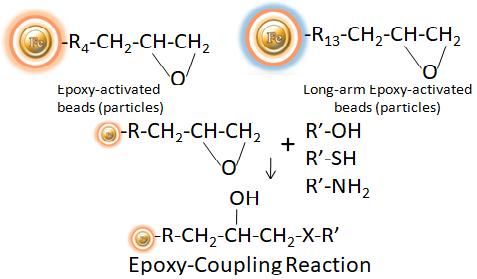 BcMag ? 環(huán)氧活化磁珠是預活化的,均勻的,表面覆蓋有高密度環(huán)氧官能團的二氧化硅基質(zhì)的磁珠。此磁珠可以用于有效地綴合伯胺基,巰基,或含羥基基團的配體(圖1)。它的親水性表面基團保證了磁珠在實驗過程中,具有極低的非特異性吸附率、且有良好的分散性,并易于在各種緩沖液中處理。環(huán)氧活化磁珠最適合大分子蛋白的結(jié)合。 BcMag?長臂環(huán)氧活化磁珠被推薦結(jié)合小肽,因為其長臂(21-原子)的親水連接基團可以減少位阻現(xiàn)象。