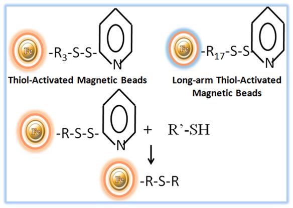 BcMagTM巰基活化磁珠是均勻的,表面覆蓋有高密度硫醇基官能團(tuán)(2-吡啶基二硫)的磁珠(圖1)。該磁珠被用來在溫和的條件,可逆的結(jié)合含有硫醇基的配體。親和純化后,可用還原劑(如DTT或β-巰基乙醇)從磁珠上切割并分離出目標(biāo)分子-配體的復(fù)合物。BcMag?硫醇活化磁珠最適于結(jié)合大分子蛋白。BcMagTM長臂硫醇活化磁珠被推薦用于結(jié)合小肽分子,因?yàn)槠溟L臂的親水連接基團(tuán)可以減少位阻現(xiàn)象。