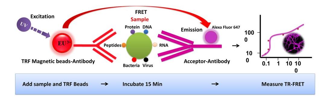 BcMag? TR-FRET測定方法與傳統(tǒng)的FRET(F?rster共振能量轉(zhuǎn)移)測定方法不同,它利用時間分辨熒光磁珠(BcMag? TR-Magnetic Beads)作為熒光供體團。供體和受體可以是兩個蛋白質(zhì)、兩個DNA鏈、抗原、抗體或配體或其它受體。在一定的時間延遲后(通常為50至100秒),當供體和受體分子靠近并以時間分辨方式進行監(jiān)測時,通過熒光共振能量轉(zhuǎn)移產(chǎn)生信號。在BcMag? TR-FRET測定方法中,微量的分析物可以通過時間分辨磁珠輕松地從樣品中富集,從而提高靈敏度。該測定方法消除了由樣品和塑料微孔板引起的所有熒光背景影響,以及直接激發(fā)受體所產(chǎn)生的背景影響。因此,BcMag? TR-FRET測定方法的信噪比非常高,背景值非常低。此外,該測定方法不需要清洗步驟。BcMag? TR-FRET測定方法在高通量篩選的生物分析中具有顯著的優(yōu)勢,如測定靈活性、可靠性、提高測定靈敏度、更高的通量和更少的假陽性/假陰性結(jié)果。
