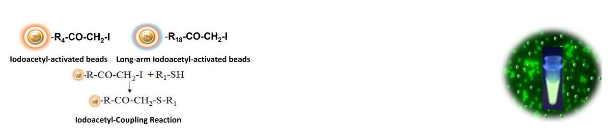 可以通過(guò)與巰基(-SH)反應(yīng)快速,高效共價(jià)固定蛋白質(zhì),多肽和其他配體,用于親和純化實(shí)驗(yàn)。在堿性生理環(huán)境(pH 7.2--9)下,在含有20-30%DMSODMF的水性或有機(jī)溶劑中,碘代乙酰基活化的載體與巰基反應(yīng),產(chǎn)生穩(wěn)定的硫醚鍵。這些反應(yīng)通常在黑暗環(huán)境下進(jìn)行,以防止游離碘的形成,因?yàn)橛坞x碘可與酪氨酸,組氨酸和色氨酸殘基反應(yīng)(圖1)。親水表面可確保磁珠的非特異性吸附低,分散性好,便于在各種緩沖液中操作。