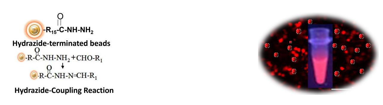 BcMag ? 酰肼基銪熒光磁珠是在表面連接高密度酰肼官能團(tuán)的時(shí)間分辨熒光(TRF)磁性微球。酰肼反應(yīng)可有效的通過(guò)糖基化位點(diǎn)標(biāo)記,固定或結(jié)合糖蛋白,糖基化位點(diǎn)通常(與大多數(shù)多克隆抗體一樣)位于遠(yuǎn)離需要保留其功能的關(guān)鍵結(jié)合位點(diǎn)的結(jié)構(gòu)域中。以這種選擇性地與靶向分子Fc部分的重鏈結(jié)合的方式偶聯(lián)抗體,有助于Fv區(qū)域末端盡可能最好地保存抗原結(jié)合活性。在pH 5至7條件下,酰肼基的載體和化合物將與氧化碳水化合物的羰基結(jié)合,從而產(chǎn)生腙鍵。