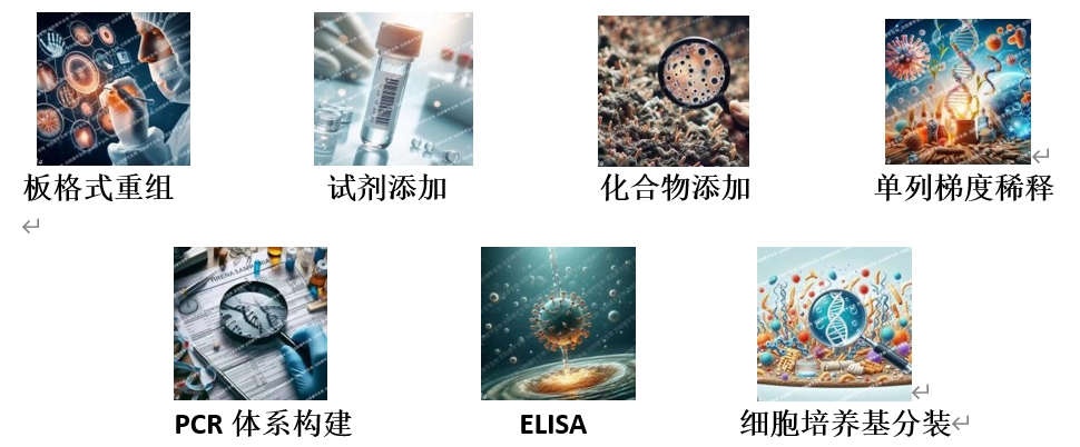X、Y、Z軸獨立運動;自動取棄吸頭;單列、多列、整板加樣;96轉(zhuǎn)384孔板加樣